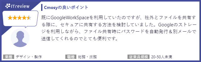 おかげさまで、Cmosy(クモシィ)は、「大容量ファイルの送受信」「管理のしやすさ」でご好評をいただいており、お客様満足度4.0(5.0点満点中)をいただいております。