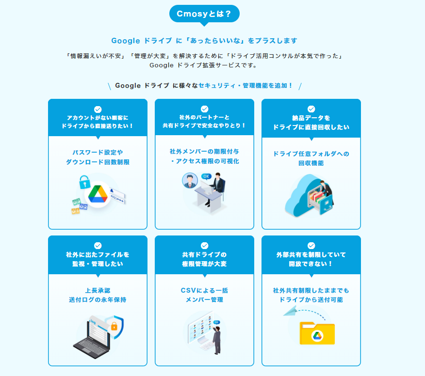 「 Cmosy 」は、吉積情報が共同で開発したファイル共有サービスです。Cmosy をご利用のお客様は Google Workspace のセキュリティポリシー(社外共有の禁止)を保持した状態でファイルを安全に社外と送受信することができます。また、共有ドライブの運用課題を解決する、権限可視化やアラート通知(ファイル数・共有期限日等)機能等、お客様の Google Workspace* 運用をサポートする様々な機能を提供しています。