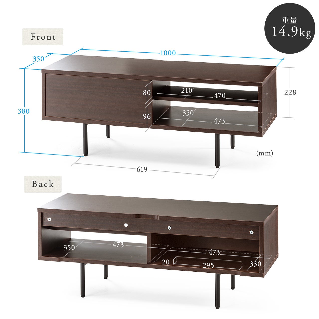本製品のサイズは約W1000×D350×H380mm、 重量は約14.9kgです。棚板が1枚付属しています。