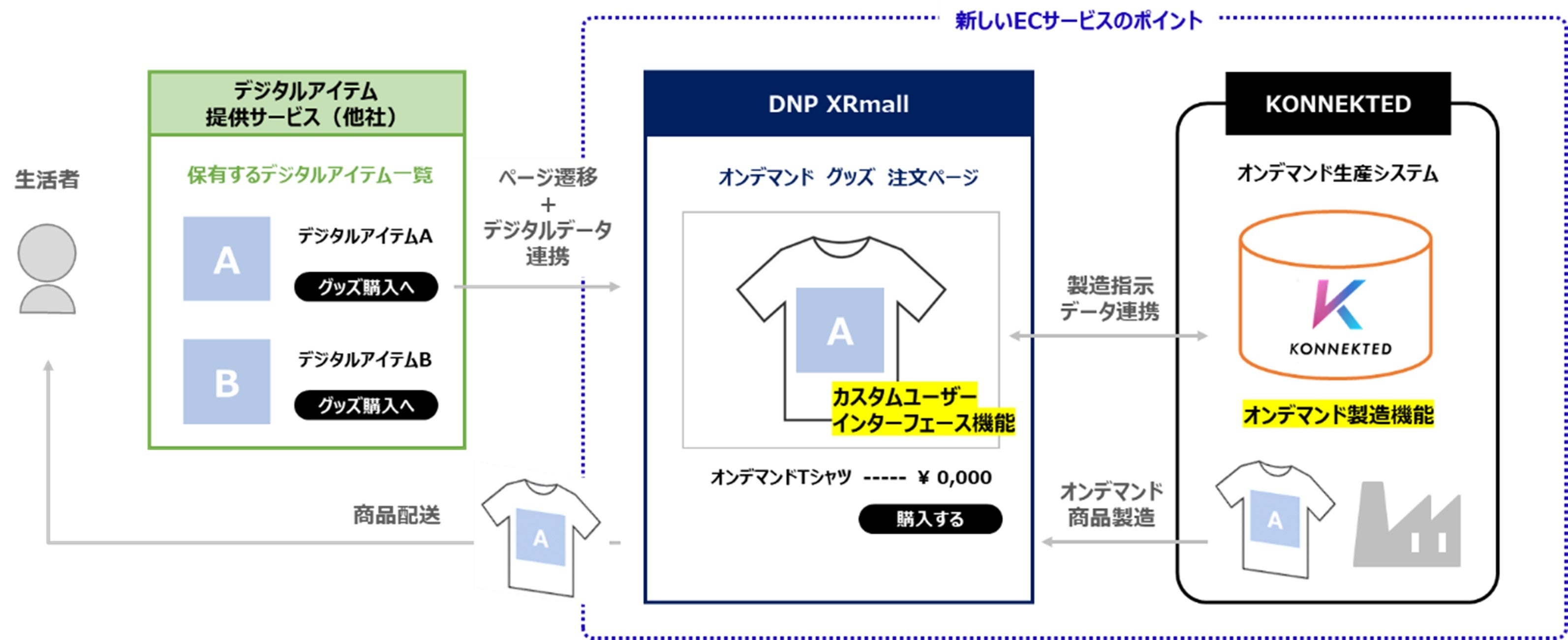 昨今バーチャル空間・メタバース上での経済活動の一つとして、アニメ・マンガ・ゲーム等の知的財産(IP:Intellectual Property)を活用したデジタルアイテムの需要が高まりを見せています。「KONNEKTED」を導入することで、アニメ・マンガ・ゲーム等のコンテンツホルダー等に提供して、新しいリアルアイテムの販売につなげるとともに、デジタルアイテム自体の価値も向上させて、ファンの満足度向上とIPの価値向上を実現していきます。