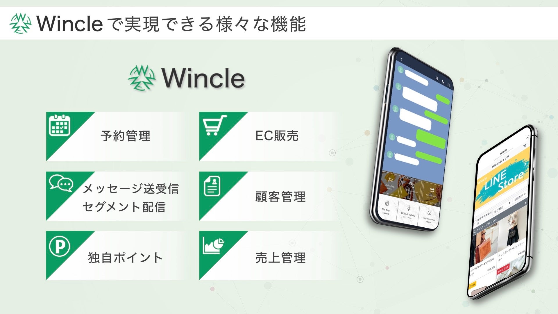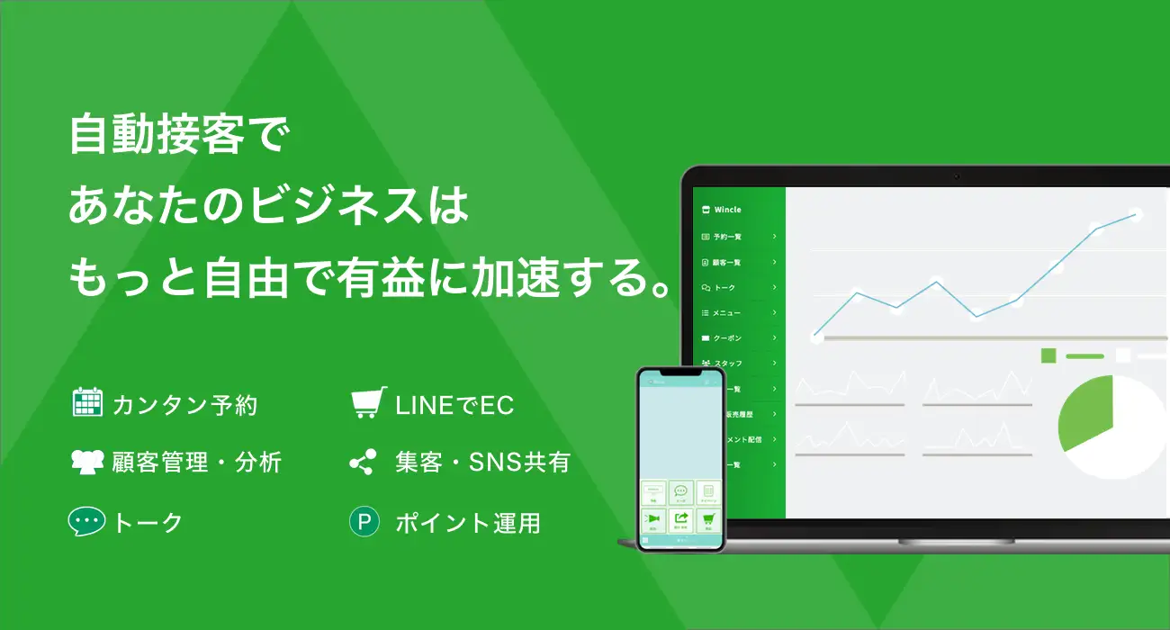 「Wincle」はLINE公式アカウントを活用し、あらゆる業種の予約、物販(ECサイト、受発注機能)、マーケティング等をLINE上で自動化できるシステムです。機能が選択できるため汎用性が高く、多様なビジネスに対応することが可能なソリューションサービスです。