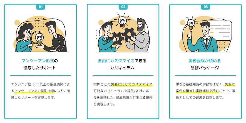 単に開発言語を教えるだけではなく、研修終了までパートナーとして伴走します。
