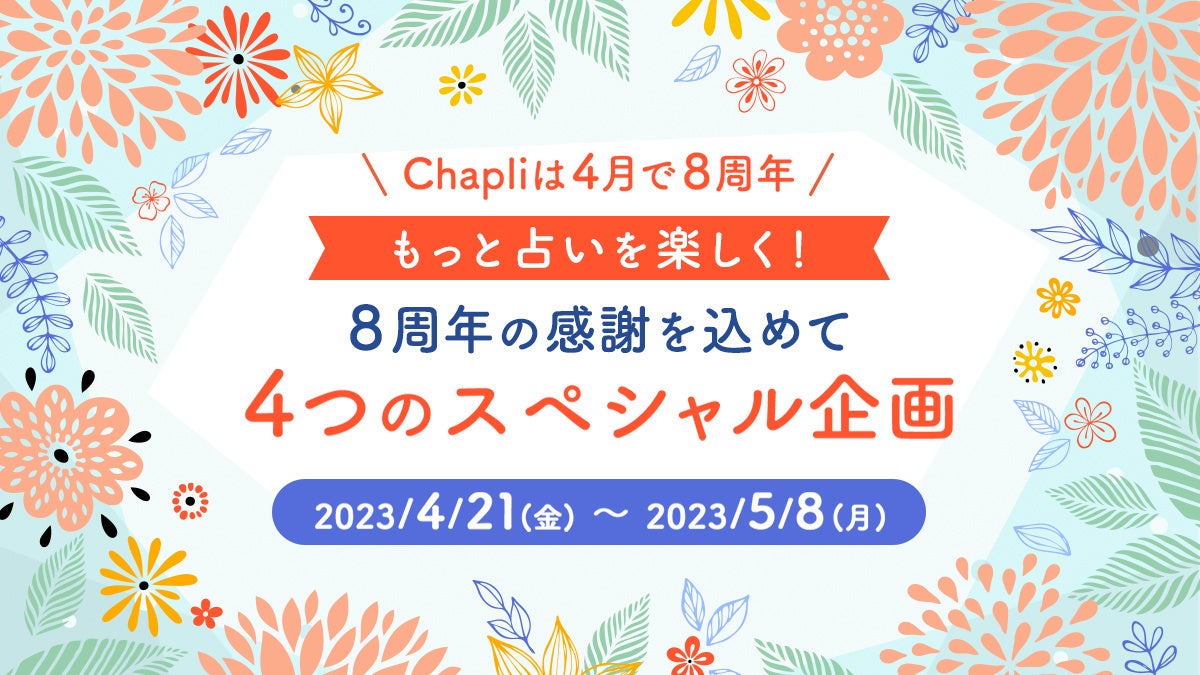 『Chapli』はサービス開始から多くのお客様にご愛顧いただき、おかげさまで8周年を迎えました。これからも楽しく『Chapli』の占いをご利用いただきたく、4つのスペシャル企画を順次開催いたします。