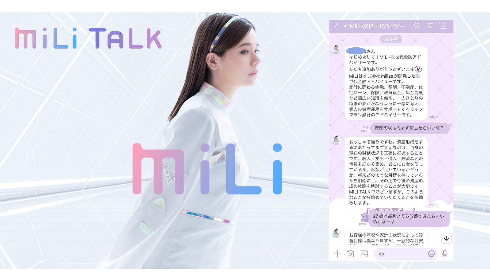 ChatGPT3.5を活用した次世代金融アドバイスサービスです。LINE のトーク画面で、お金に関する質問(家計、不動産、年金、保険等)をすると、30年後の銀行員をイメージしたオリジナルキャラクター、次世代金融アドバイザー「MiLi」が会話形式で回答します。質問をする上で、条件を指定(ご自身の今の状況)や、複数の質問は段階的に分割して質問をすると、より知りたいことに回答してくれる可能性が高くなります。