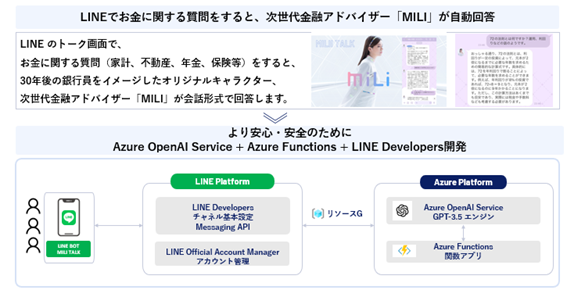 ChatGPT3.5を活用した次世代金融アドバイスサービスです。LINE のトーク画面で、お金に関する質問(家計、不動産、年金、保険等)をすると、30年後の銀行員をイメージしたオリジナルキャラクター、次世代金融アドバイザー「MiLi」が会話形式で回答します。質問をする上で、条件を指定(ご自身の今の状況)や、複数の質問は段階的に分割して質問をすると、より知りたいことに回答してくれる可能性が高くなります。
