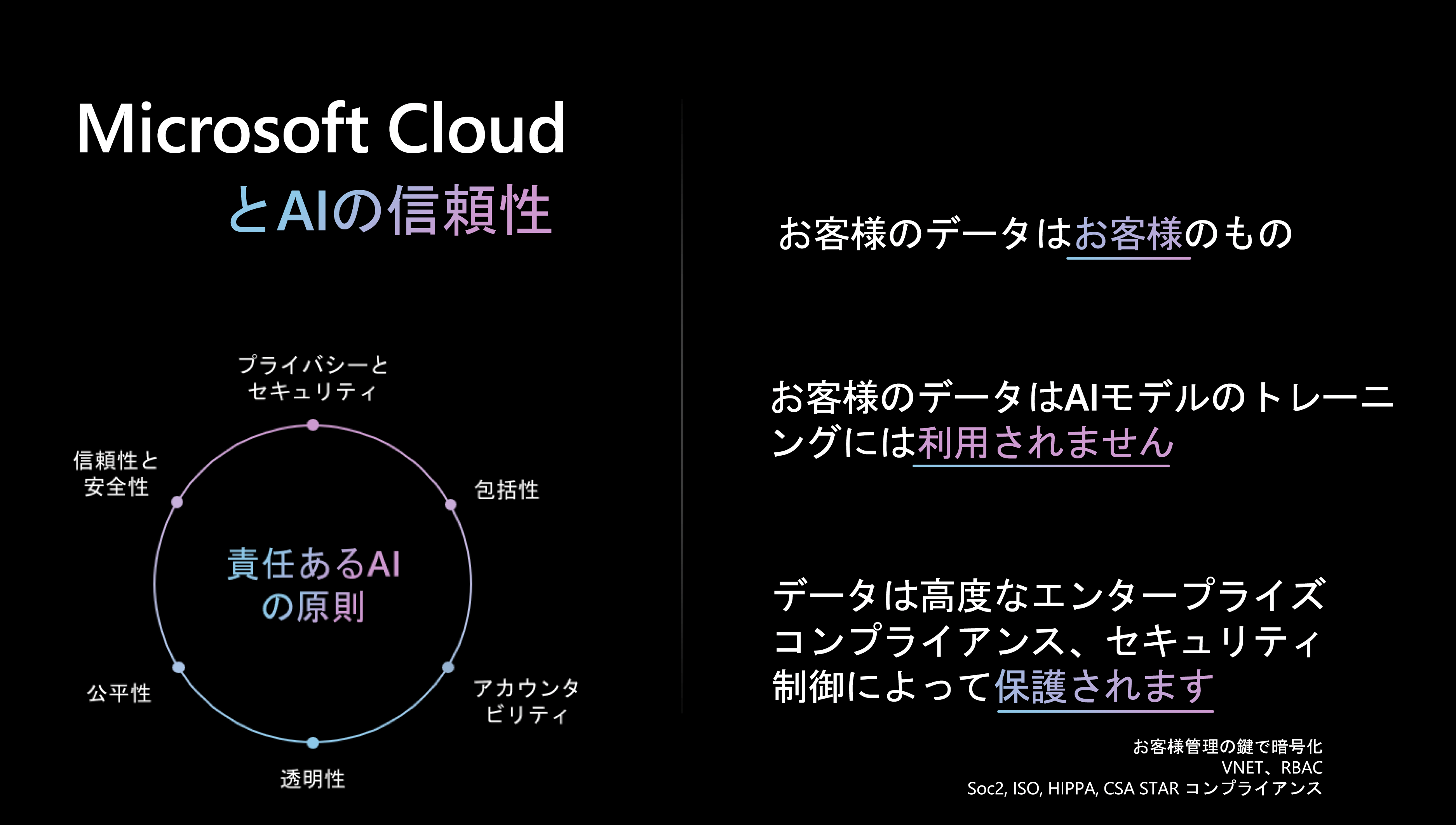 お客様のデータはAIモデルのトレーニング(学習)には利用されません。そのため、お客様のデータはお客様自身のものであるというプライバシーの保護および、AIの信頼性が担保されます。