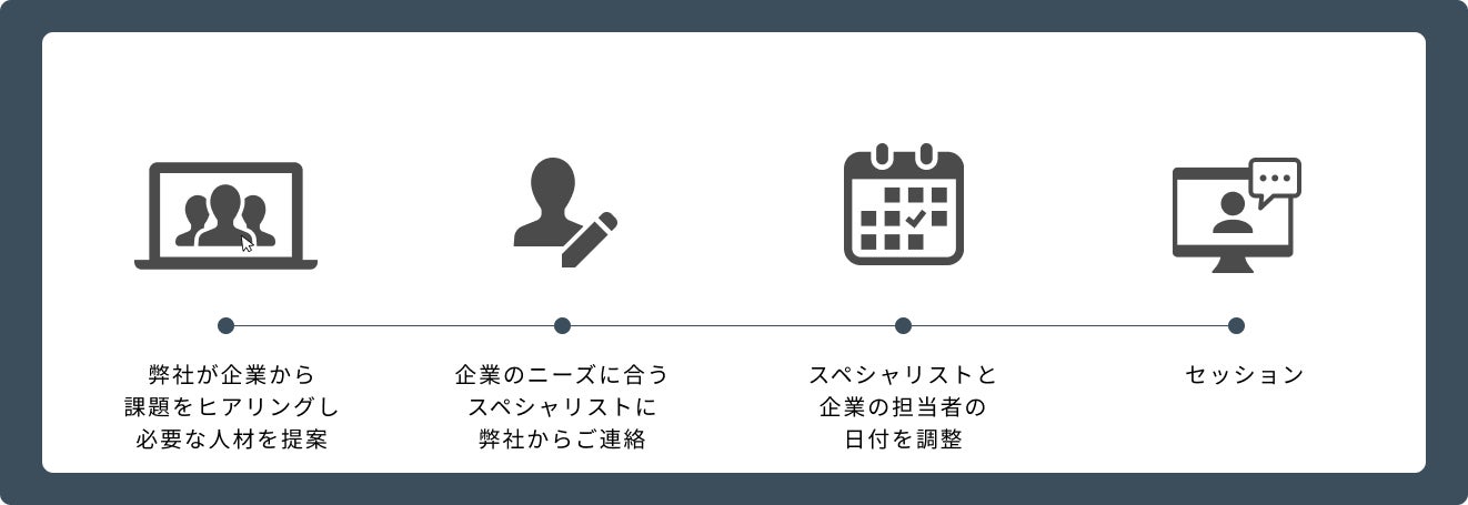 スペシャリストのマッチングは弊社が行います。どのような課題を解決したいのかをヒアリングし、最適なスペシャリストをご提案します。