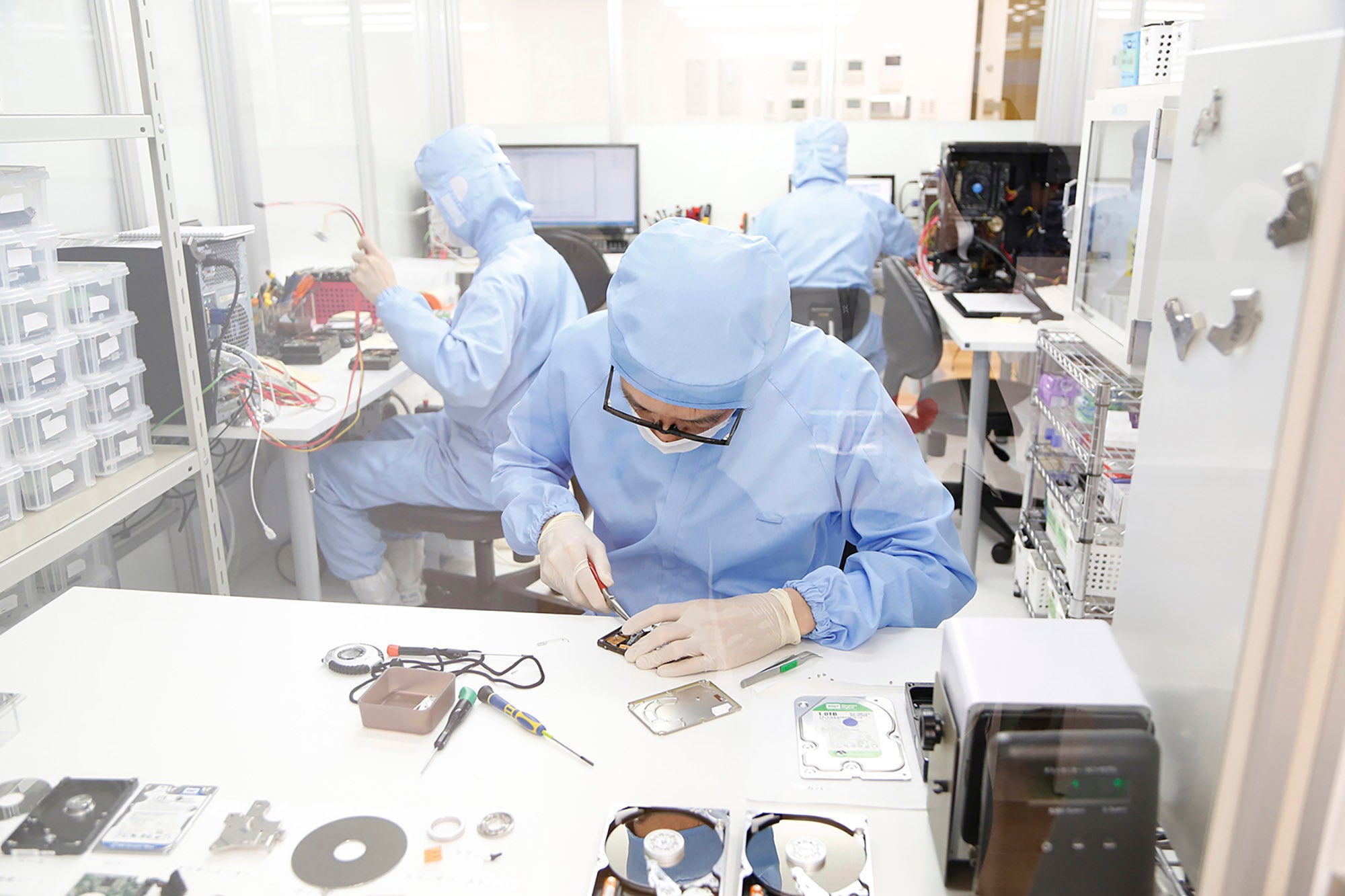 また、弊社では最大4台までのHDDを同時に開封できるクラス100のクリーンルームを保有しています。無菌手術室と同等レベルの設備で、微小なチリすらスクラッチの原因になるHDDを安全に開封・修復し、データを1つでも多く取り出せるように、数人のエンジニアが専用の作業服で業務に取り組んでいます。
