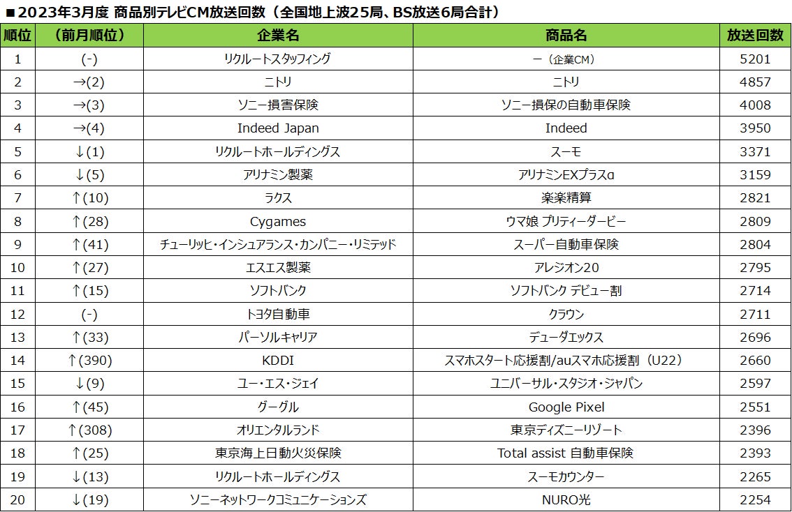 2023年3月度の商品別ランキングは、1位にリクルートスタッフィングの企業CM、2位にニトリ「ニトリ」、3位にソニー損害保険「ソニー損保の自動車保険」となりました。2位ニトリ「ニトリ」、3位ソニー損害保険「ソニー損保の自動車保険」、4位Indeed Japan「Indeed」という並びは、2023年2月度のランキング(*1)と同一でした。