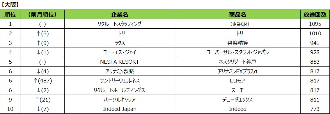 アミューズメント施設のCMについては、オリエンタルランド「東京ディズニーリゾート」は東京地区、ユー・エス・ジェイ「ユニバーサル・スタジオ・ジャパン」は大阪地区と名古屋地区でランクインしており、施設周辺エリアの人にアプローチしていることが見て取れます。また、大阪地区では5位にNESTA RESORT「ネスタリゾート神戸」がランクインしていました。