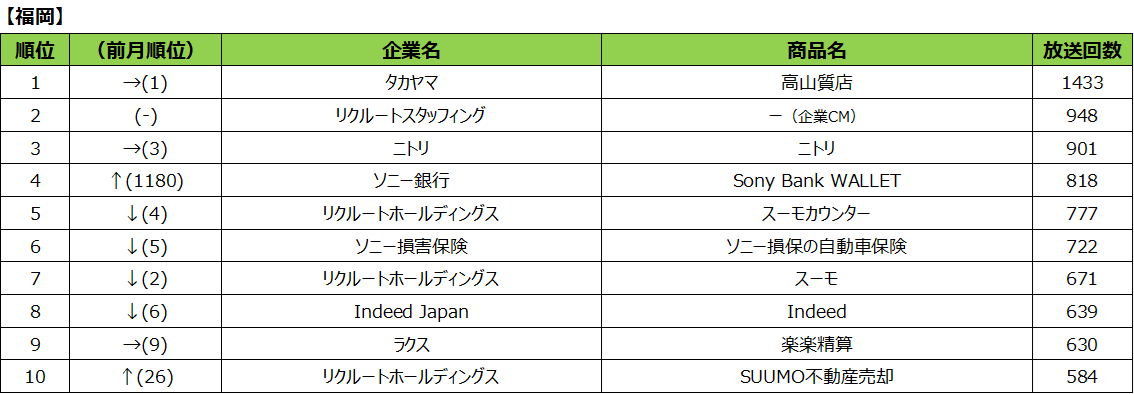 リクルートスタッフィングの企業CM及びIndeed Japan「Indeed」は、東京・大阪・名古屋・福岡・札幌のエリア別ランキングにランクインしていました。一方、ハイクラス向けの転職サービスであるパーソルキャリア「デューダエックス」は、東京地区・大阪地区・名古屋地区ではランクインしていますが、福岡地区・札幌地区ではランキング圏外となっていました。
