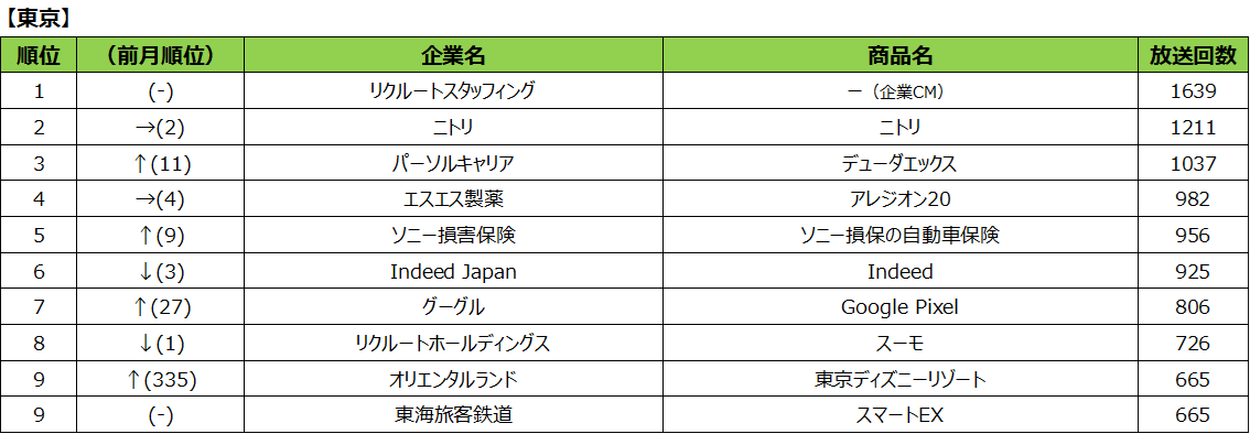 2023年3月度の商品別ランキングは、1位にリクルートスタッフィングの企業CM、2位にニトリ「ニトリ」、3位にソニー損害保険「ソニー損保の自動車保険」となりました。2位ニトリ「ニトリ」、3位ソニー損害保険「ソニー損保の自動車保険」、4位Indeed Japan「Indeed」という並びは、2023年2月度のランキング(*1)と同一でした。