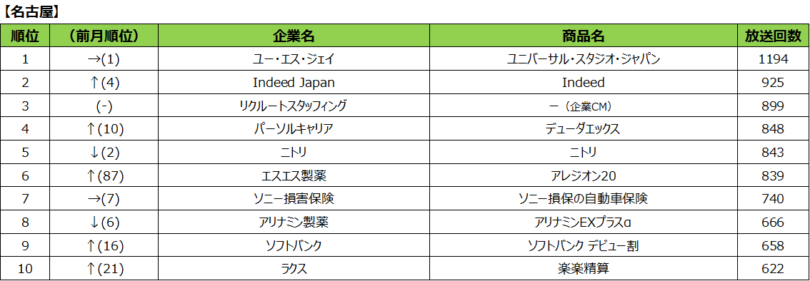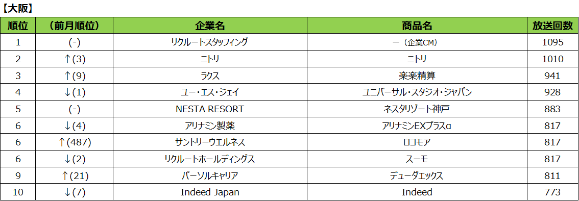 アミューズメント施設のCMについては、オリエンタルランド「東京ディズニーリゾート」は東京地区、ユー・エス・ジェイ「ユニバーサル・スタジオ・ジャパン」は大阪地区と名古屋地区でランクインしており、施設周辺エリアの人にアプローチしていることが見て取れます。また、大阪地区では5位にNESTA RESORT「ネスタリゾート神戸」がランクインしていました。