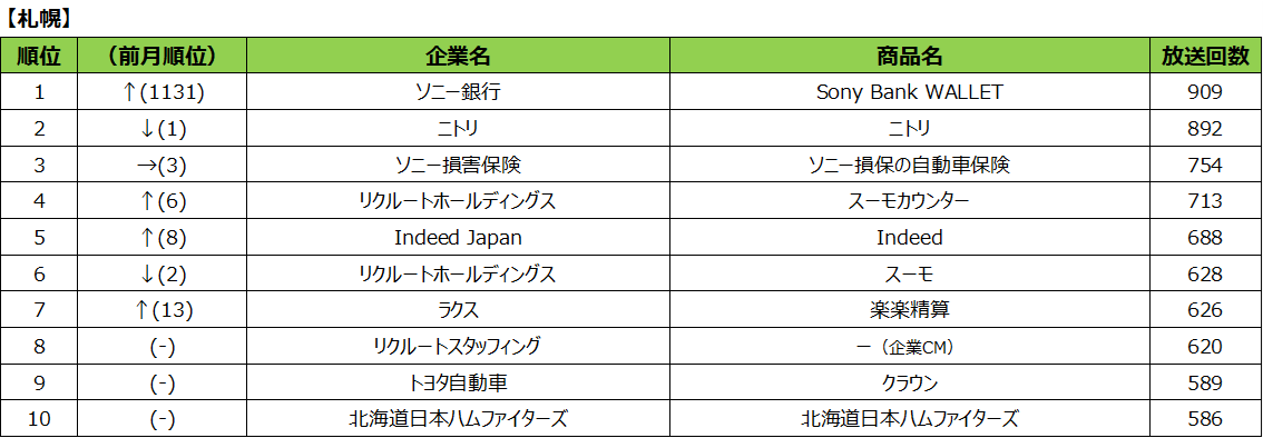 各地区で商品別ランキングと似た商材が並ぶ中、札幌地区では10位に北海道日本ハムファイターズ「北海道日本ハムファイターズ」がランクイン。2023年3月の新球場「エスコンフィールドHOKKAIDO」の開業が、出稿の増加に影響したと考えられます。