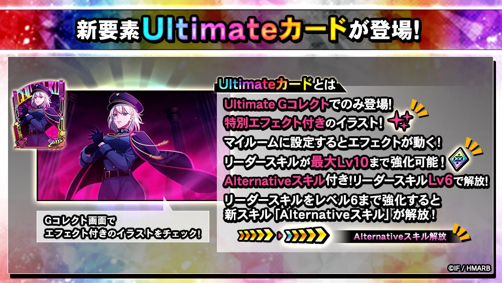 Ultimateカードとは「Ultimate Gコレクト」で獲得できる特別エフェクトアニメーション付きのカードです。通常のSSRカードと異なり、リーダースキルを最大Lv10まで強化することができます。Lv6まで強化すると、KILLER SCRATCH!!中に発動する新スキル「Alternativeスキル」が解放されます。