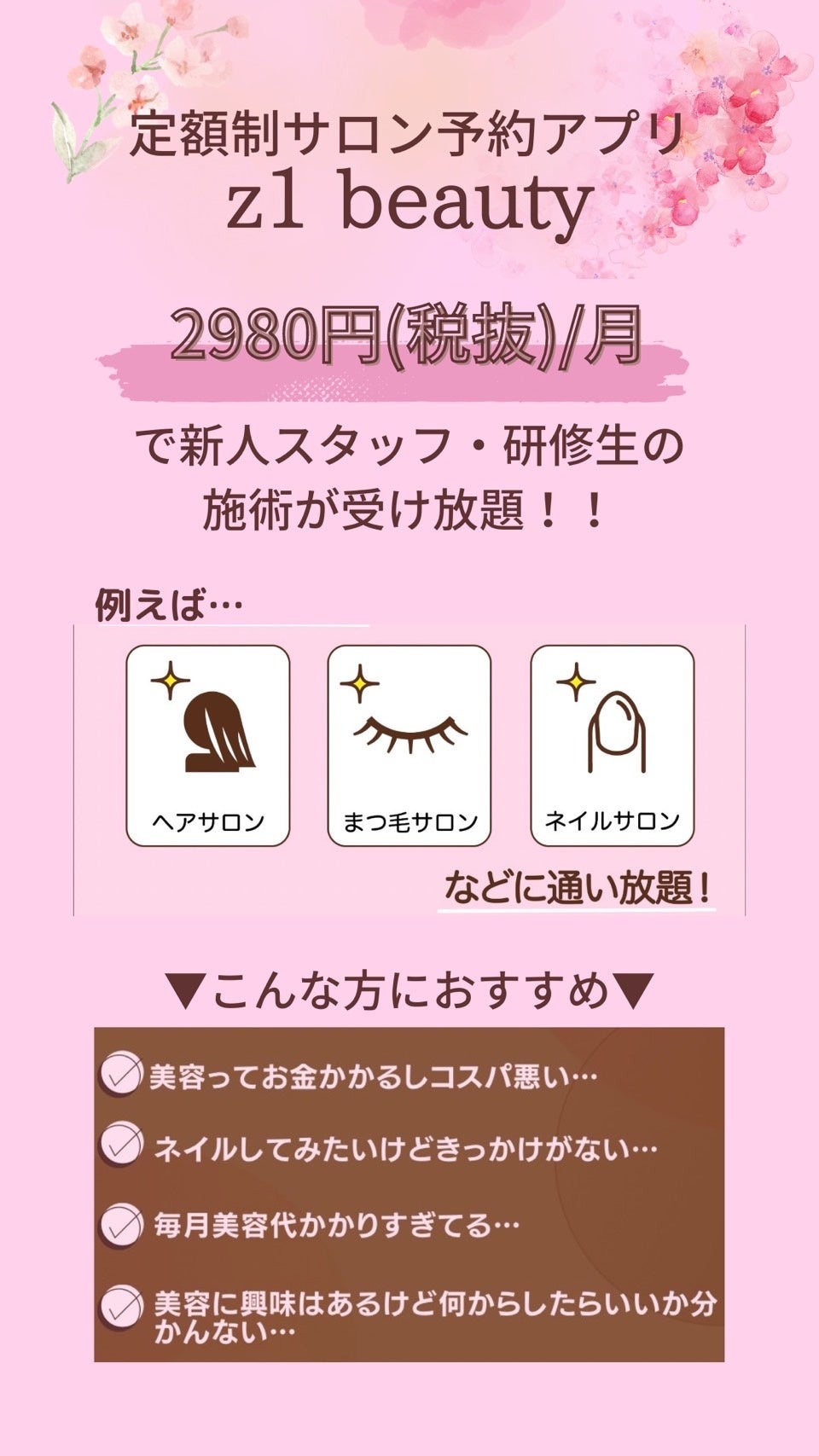 は、美容体験サブスクリプションサービスで、月額2980円+税で、掲載中の美容サロンにて新人スタッフや研修生の施術が受け放題です。