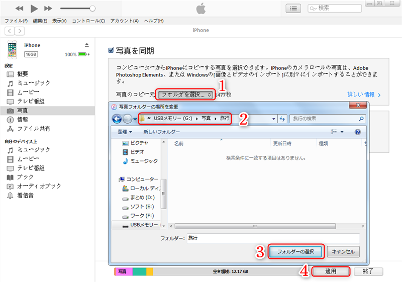 パソコンとiPhone/iPadをUSBケーブルで接続し、iTunesの画面でフォトライブラリを同期することで、USBメモリの写真をiPhone/iPadに転送することができます。