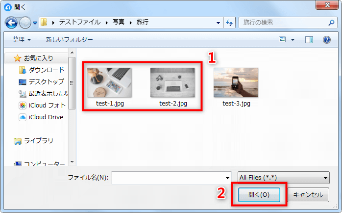 4. USBメモリから写真を選択します。ファイルを複数選択する場合は「Ctrl」あるいは「Shift」キーを押しながらクリックし、その後「開く」をクリックします。