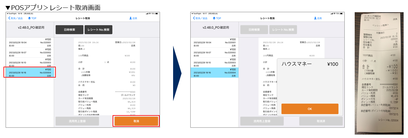 ハウスマネー、ポイントの利用取り消しが完了し、取消レシートが印字される