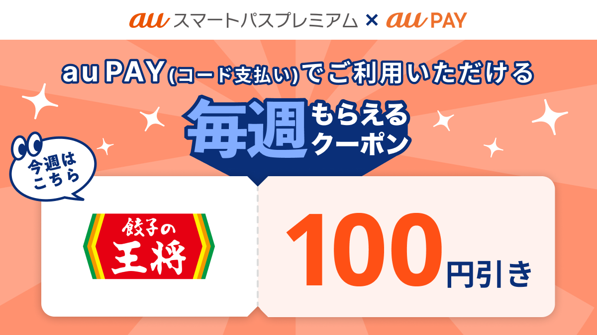 概要:全国の餃子の王将において、au PAYで101円以上のお支払いに使える100円割引クーポンをプレゼントします。