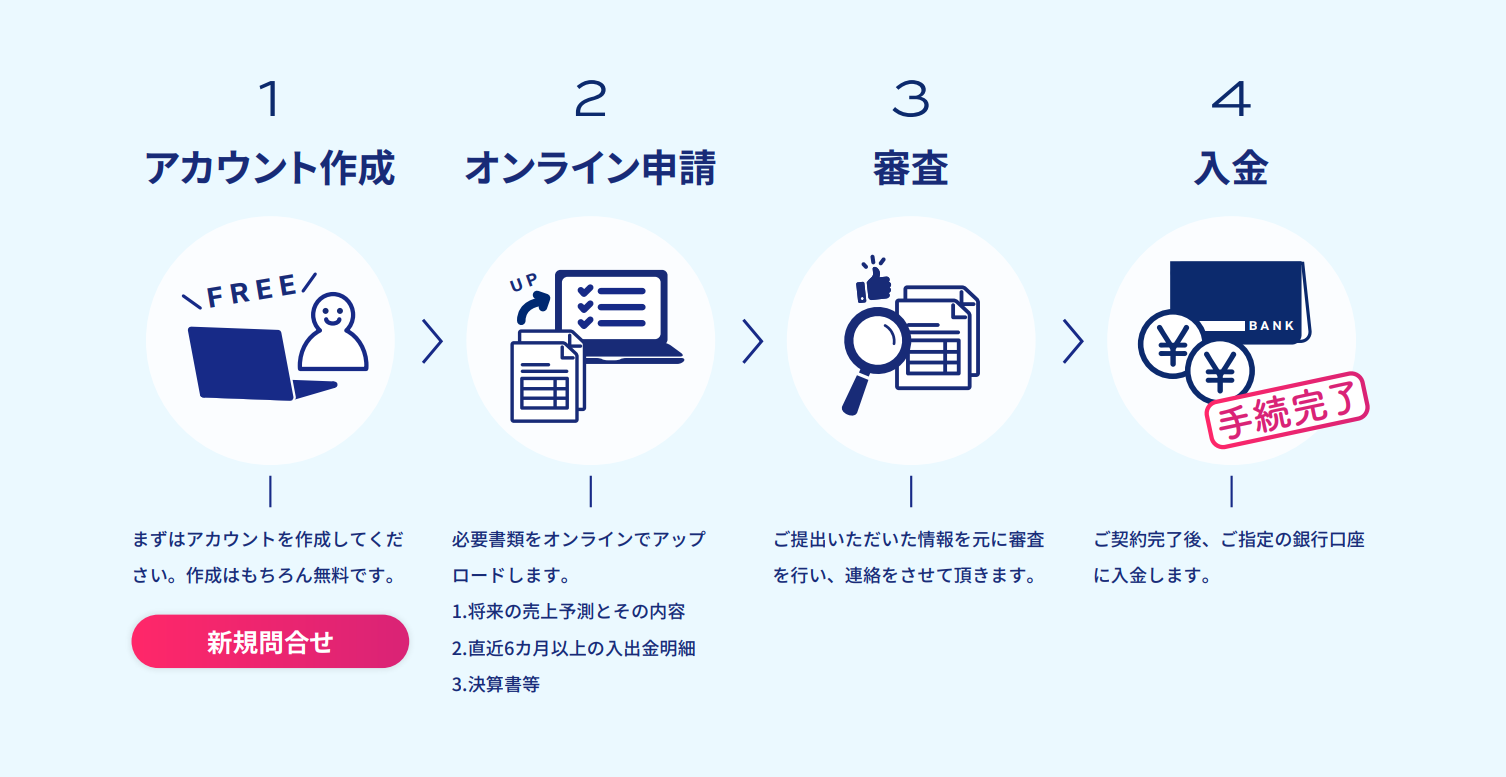 (本人確認書類、直近6ヶ月分以上の入出金明細、決算書一式、将来売上予測とその内容等)