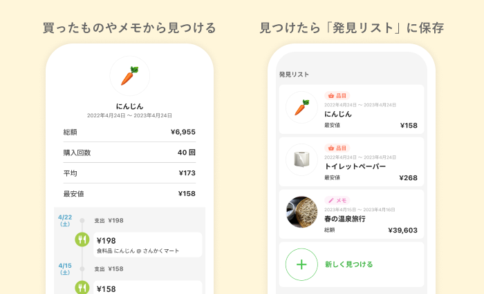 レシート撮影やショッピングサイトとの連携、入力した品目メモの内容を元に、買った商品の金額や購入回数、平均金額や総額、購入店舗などを振り返ることができます。これにより、次に購入するタイミングや店舗などを検討しやすくなり、ユーザーにとってより最適な買い物の体験につなげていただけます。さらに、頻繁に購入する商品は、「発見リスト」に保存※することで、次回から簡単に調べられるようになります。