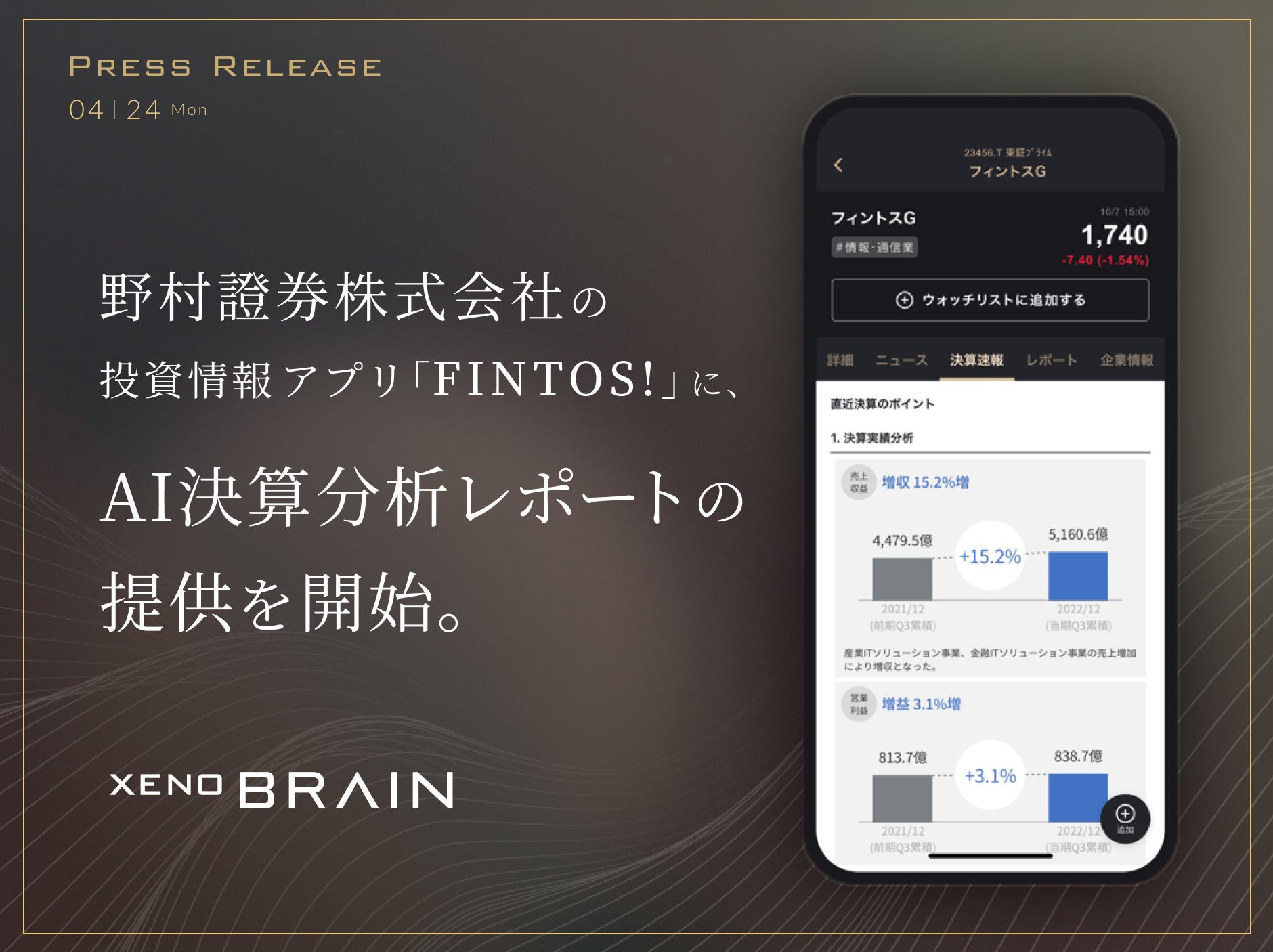 ゼノデータ・ラボは2023年1月に、独自の分析コンテンツを野村HDの個人投資家顧客向けに連携を行うことを目的として、野村HDから資金調達を実施しています。この度は、本提携の施策第一弾として、ゼノデータ・ラボが祖業として複数の証券会社等に提供実績を持つAI決算分析レポートを、FINTOS!ユーザー向けに提供開始いたしました。