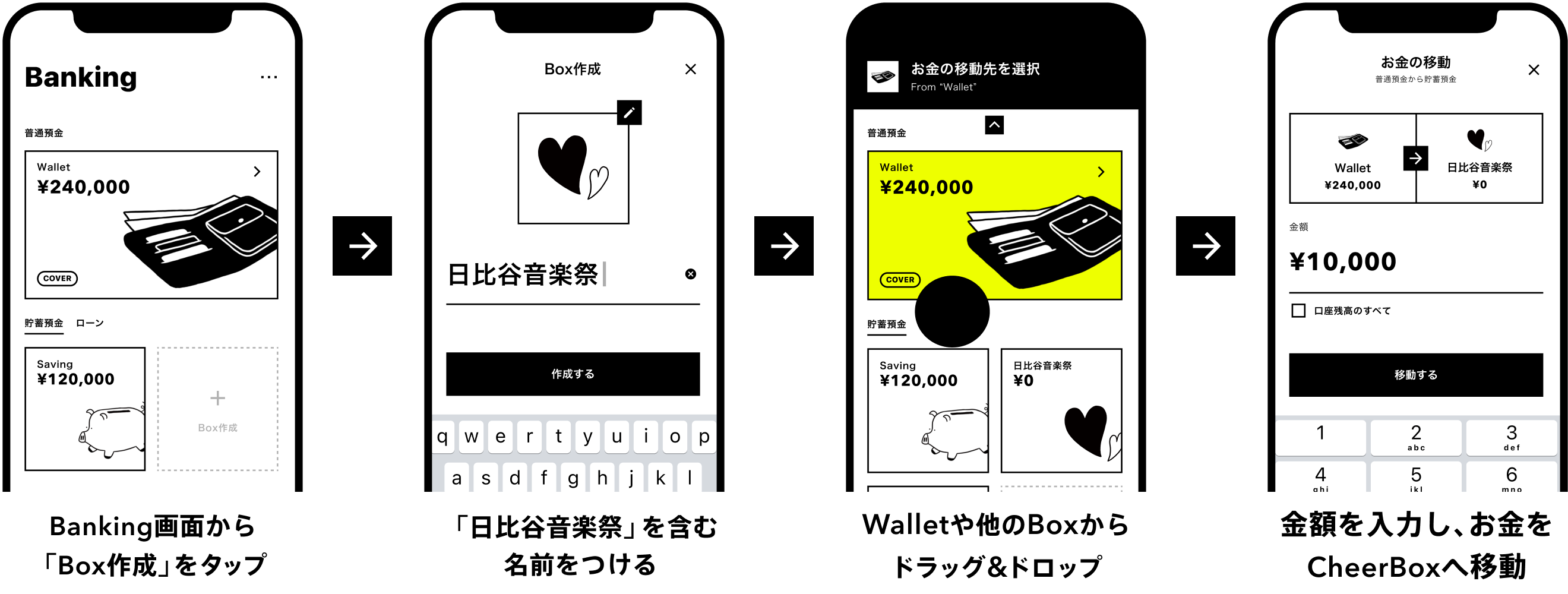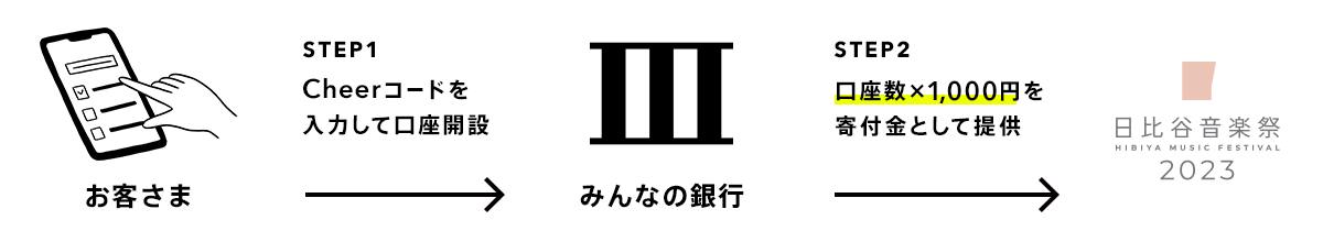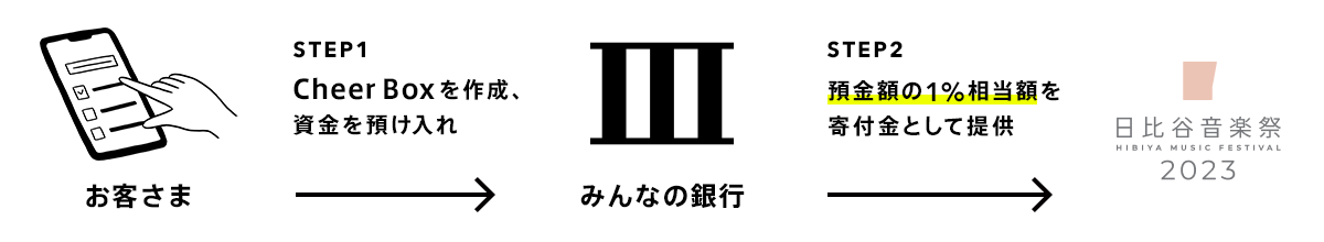 日比谷音楽祭の6文字を含む名前を付けたCheer Boxにお金を預けていただくことで、みんなの銀行がファンの皆さまに代わって、Cheer Box預金残高の1%を、日比谷音楽祭実行委員会にお届けします。