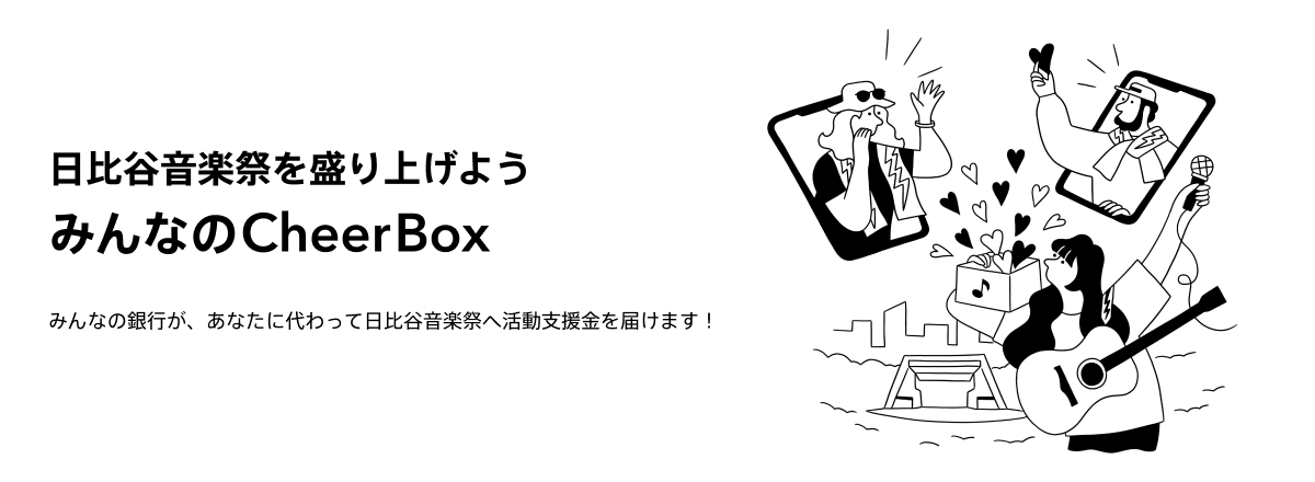 新しい銀行のカタチを「みんな」で創ることを目指して誕生したみんなの銀行は、「音楽の新しい循環をみんなでつくる、フリーでボーダレスな音楽祭」をコンセプトに掲げる日比谷音楽祭の想いに共感し、「日比谷音楽祭Cheer Box/Cheerコード」の取組みを開始しました。