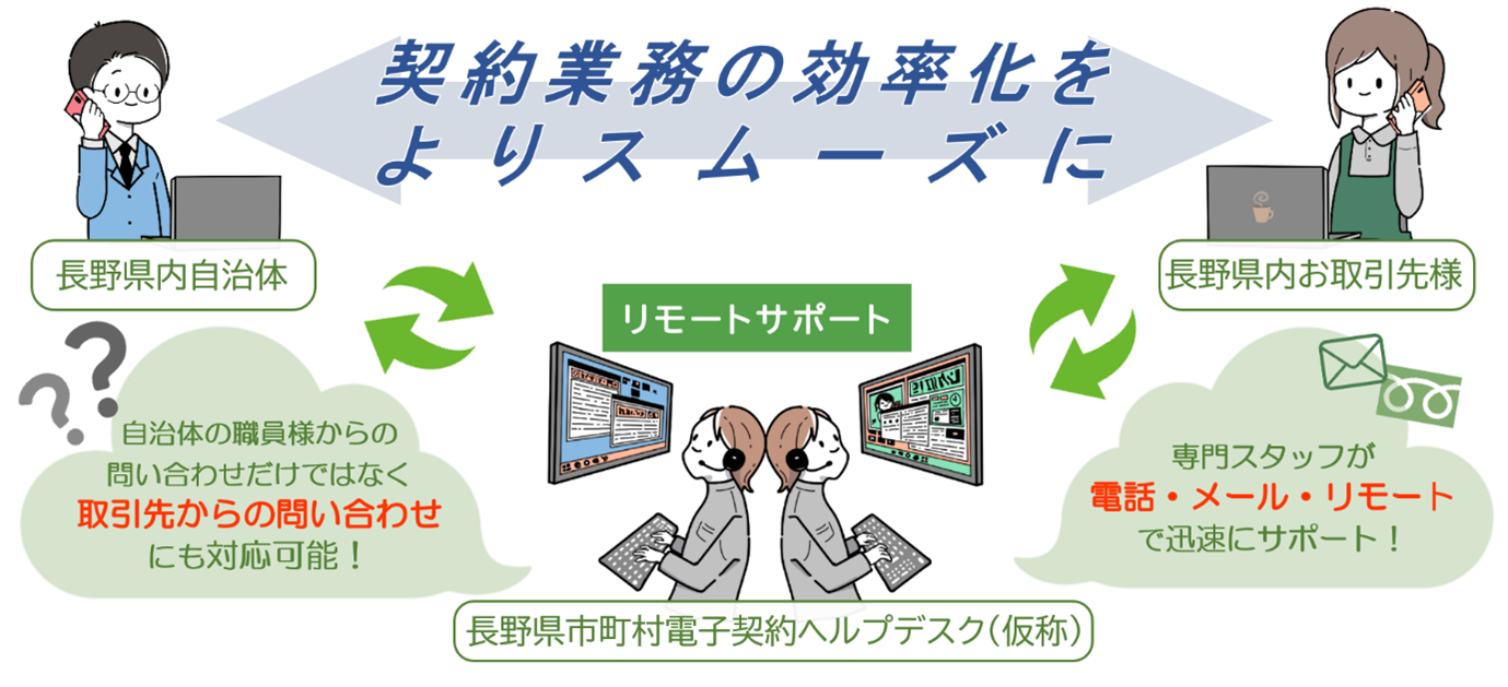 あわせて、ご要望の自治体には「共同利用専用ヘルプデスク」として、電子契約サービスの利用方法やトラブルシュートなどについて長野県内の自治体の職員さまから取引先さままで一元サポート(電話・メール・リモートサポート)する専用ヘルプデスクを安価に提供することにより、円滑な地域のDX推進を支援してまいります。