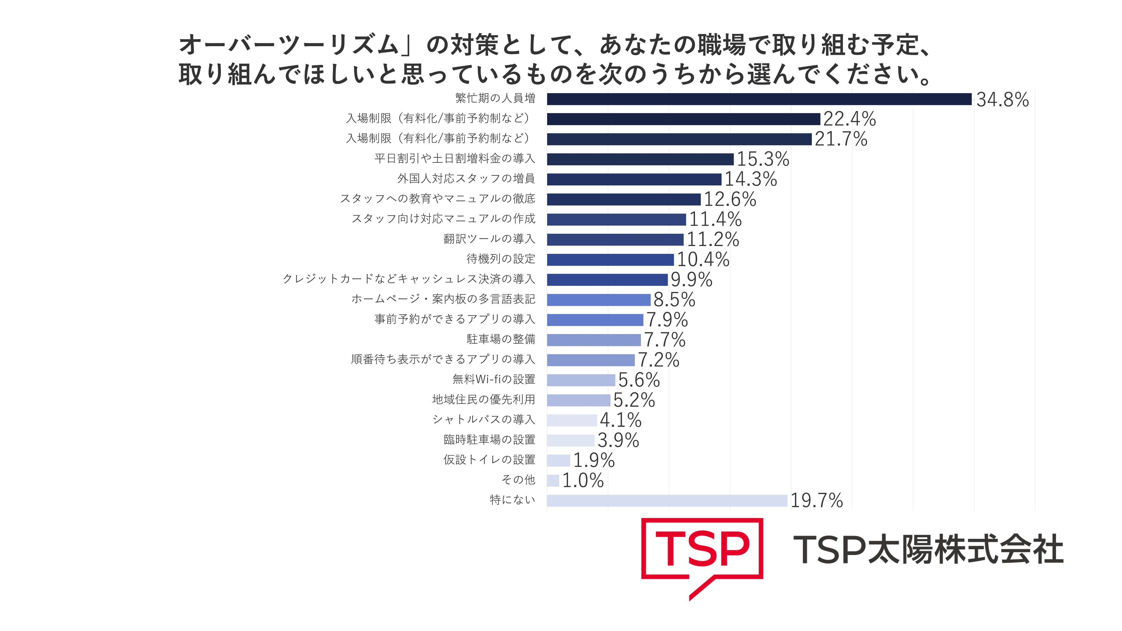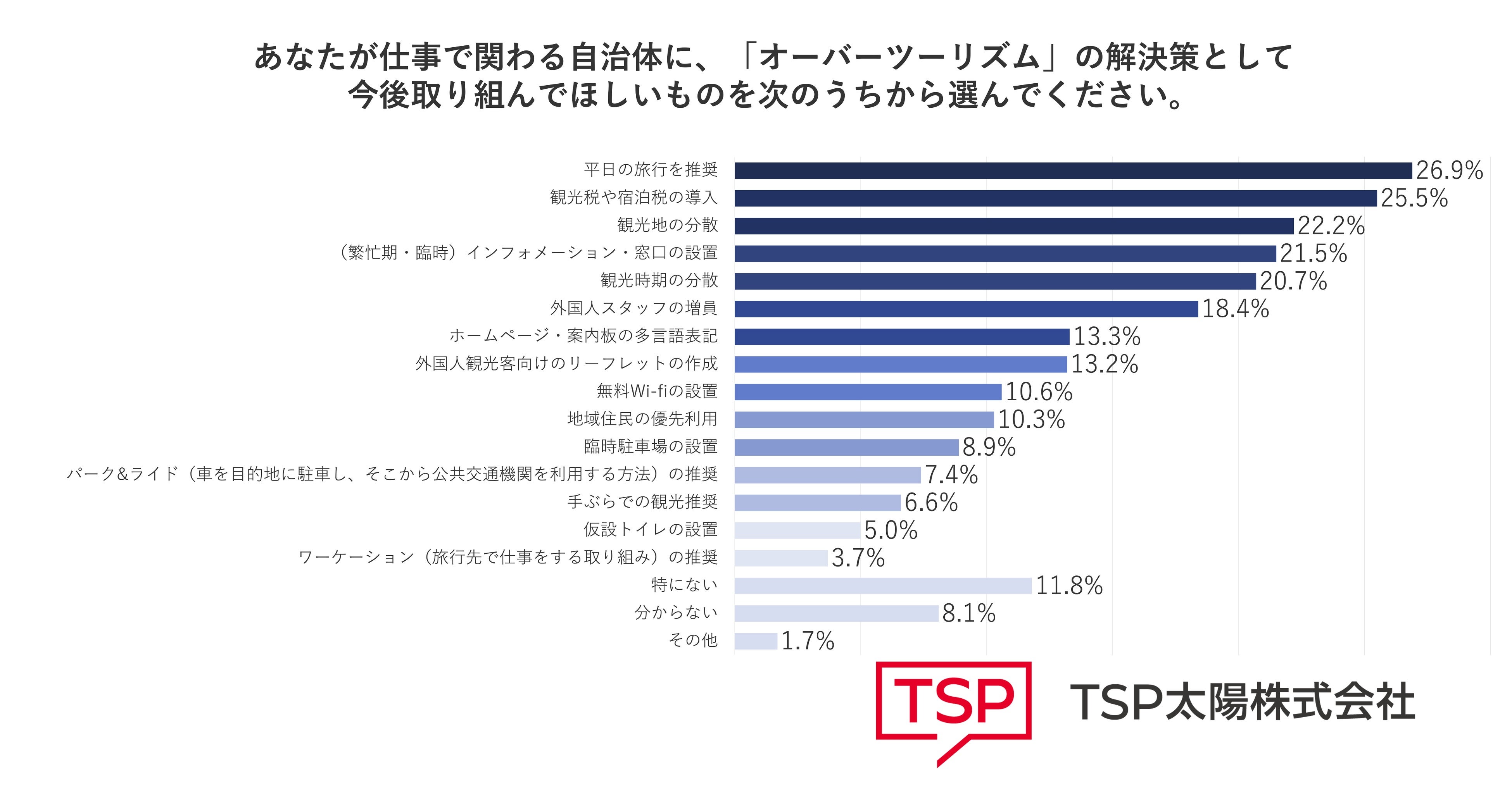 オーバーツーリズムへの対策として、職場・自治体が取り組んでいることについてアンケートをとったところ、職場においては「繁忙期の人員増」「入場制限(有料化・事前予約など)」「入場者の分散」「キャッシュレス化」などが挙げられました。自治体では「平日旅行の推奨」「観光税や宿泊税の導入」「観光時期の分散」「インフォメーション・窓口の設置」などの対策をとっていることがわかります。ですが、「特にない」という回答が職場においても約3割、自治体では「特にない・わからない」が約4割と、具体的な対策が取られていないという問題も明らかになりました。
