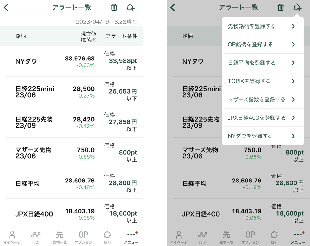 「アラート一覧」画面にて、「日経平均が〇〇円以上になったら」等、様々な条件でアラートを設定し、通知が可能です。プッシュ通知も併せて設定する事で、取引チャンス等の重要なタイミングを見逃さずチェックすることができます。