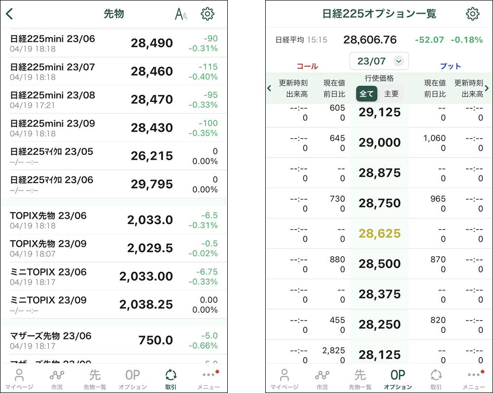 「松井証券 先物OPアプリ」には、投資情報の収集から、入出金、注文まで、先物・オプション取引に必要な機能が網羅されており、松井証券に先物・オプション口座をお持ちであれば全て無料でご利用いただくことができます。口座をお持ちでない方でも、一部の画面操作を体験いただくことができますので、ぜひこの機会に松井証券の先物OPアプリをお試しください。