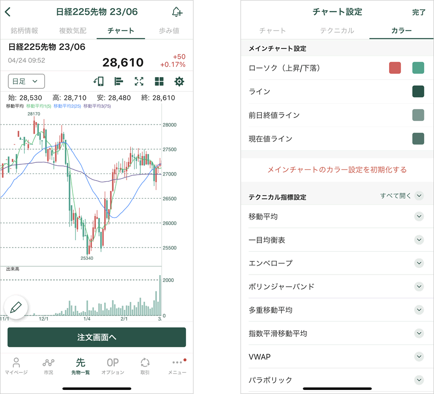 その他、描画ツールや横画面表示の利用はもちろん、足種やテクニカル指標のカラーも自由に選ぶことができます。