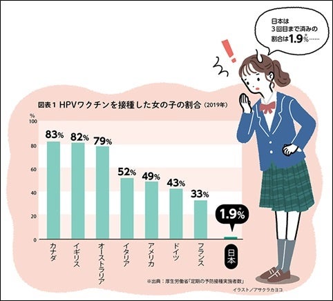 一方で、子宮頸がんはワクチンによって発症を予防できるがんです。子宮頸がんにつながるHPVの感染はワクチン接種で防ぐことができ、最も新しい9価ワクチンでは子宮頸がんの90%以上を予防できると言われています。世界保健機関(WHO)も接種を推奨しており、2020年11月時点で110か国で公的な接種が行われ、カナダやイギリス、オーストラリアなどの接種率は約8割となっています。しかしながら日本の接種率は2019年時点で1.9%(3回まで接種済み)と圧倒的に低い水準にとどまっており、先進7か国で最下位となっています。このことが日本の患者数の増加傾向、患者の若年化の要因の一つと考えられます。