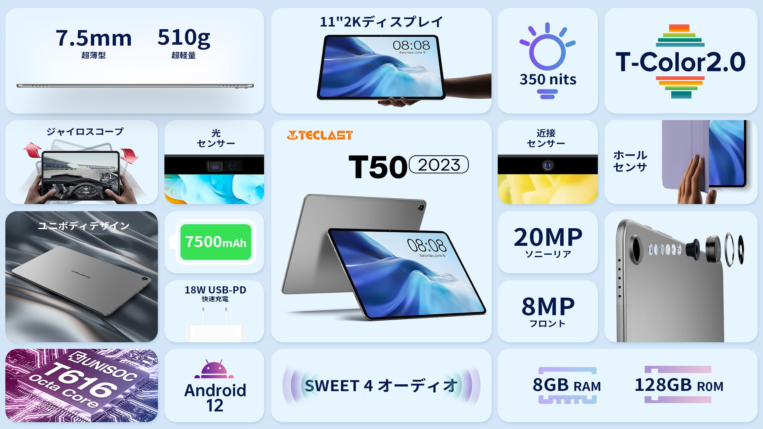 Teclast「T50」は、UNISOC Tiger T616は12nmプロセスを使用し、2つのArm Cortex-A75ハイパワーコアと6つのCortex-A55インテリジェントAIコアを搭載しています。発熱を抑えながら優れた性能を維持します。RAMは8GBで、スムーズな体験を提供できます。ストレージは128GBで、マルチタスクとファイルの保存を心配することなく楽しめます。更に多くのストレージを実現するMicro SDカードの拡張もサポートしています。