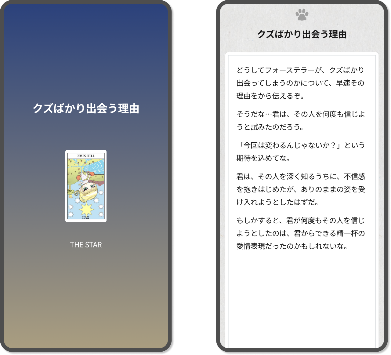 タロットカードのデザインはフォーステラーのキャラクターが描かれたオリジナルデザインを用いています。
