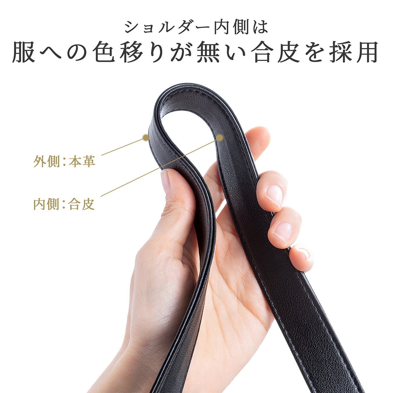 肩に掛けたまま荷物を出し入れしたり、コートの上から肩掛けしたりできる長めのショルダーベルトを装備しています。ショルダーベルトの内側には衣類への色移りの心配が無い合皮を使用しています。
