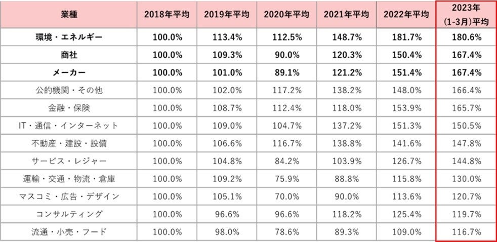 求人件数は2018年平均と比較しすべての業種で増加した。最も増加している業種は「環境・エネルギー」で180.6%、次いで「商社」「メーカー」で167.4%だった。企業の採用活動が活発化している様子がうかがえる。【図5】