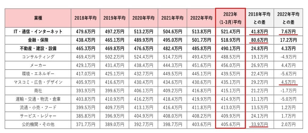 2022年平均と比較し増加額が最も高かったのは「金融・保険」で17.2万円増。次いで「IT・通信・インターネット」が7.6万円増、「マスコミ・広告・デザイン」は4.5万円増となった。【図4】