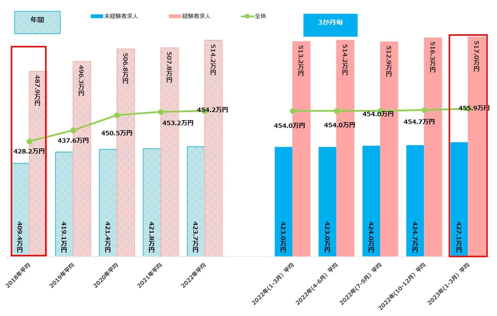 23年1-3月の平均初年度年収は455.9万円。求人件数は2018年比148.4%と、企業の人材獲得競争はさらに激しく【図1、2、3】