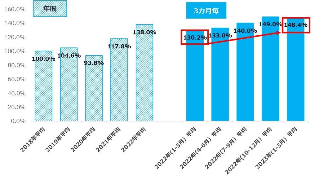求人件数は2018年平均と比べると148.4%で、2022年1-3月平均(130.2%)から18.2pt増加した。また、3カ月ごとにみると、2022年から増加した求人件数は高止まりしており、昨今の人手不足を背景に、企業の人材獲得競争は今後も激しいものになると予想される。今後は給与待遇の改善やオフィス環境整備など、人材への投資を重要視する企業がさらに増えると考えられる。【図2】
