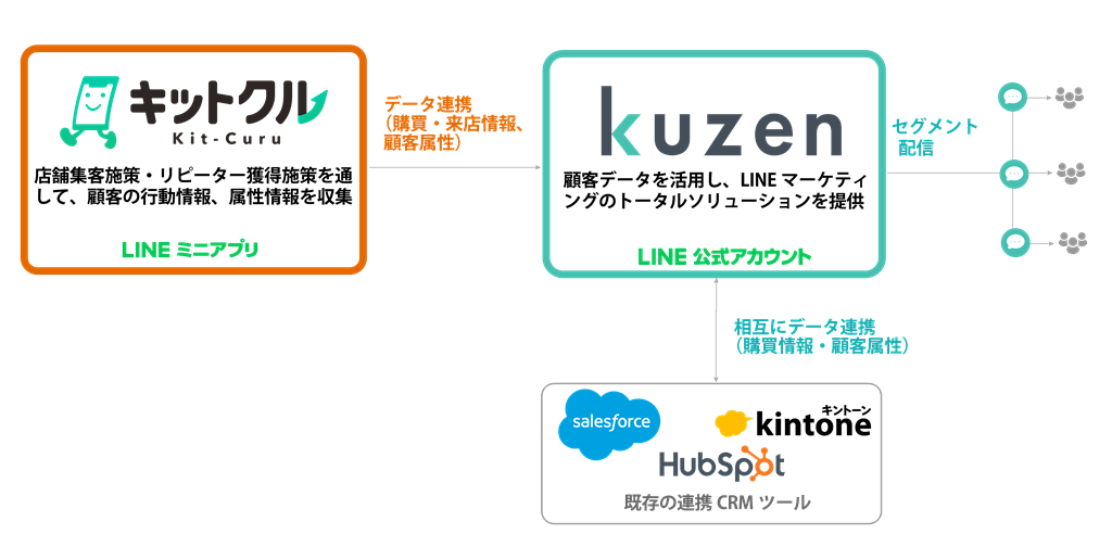 アイリッジでは、店舗集客のきっかけとなるクーポンやスタンプカードに加え、会員登録機能や友達紹介機能などを搭載したLINEミニアプリを最短3週間で利用開始できる「Kit-Curu」を2022年11月に開始し、サービス業や飲食店など「来店=購買」となる業態の販促支援をおこなっています。「Kit-Curu」で提供するLINEミニアプリではクーポンやスタンプの利用状況、登録した属性情報などのデータを取得することが可能で、これまでLINEミニアプリ内での特定顧客限定クーポンや期間限定クーポン、枚数限定先着クーポンなどの発行に活用されてきました。今回の連携により、これらのデータを「KUZEN」を通じたLINE公式アカウントでのセグメント配信にも活用し効果を最大化できるようになります。また、両者はソリューション販売においても連携し、それぞれの顧客への拡販に協力していく予定です。