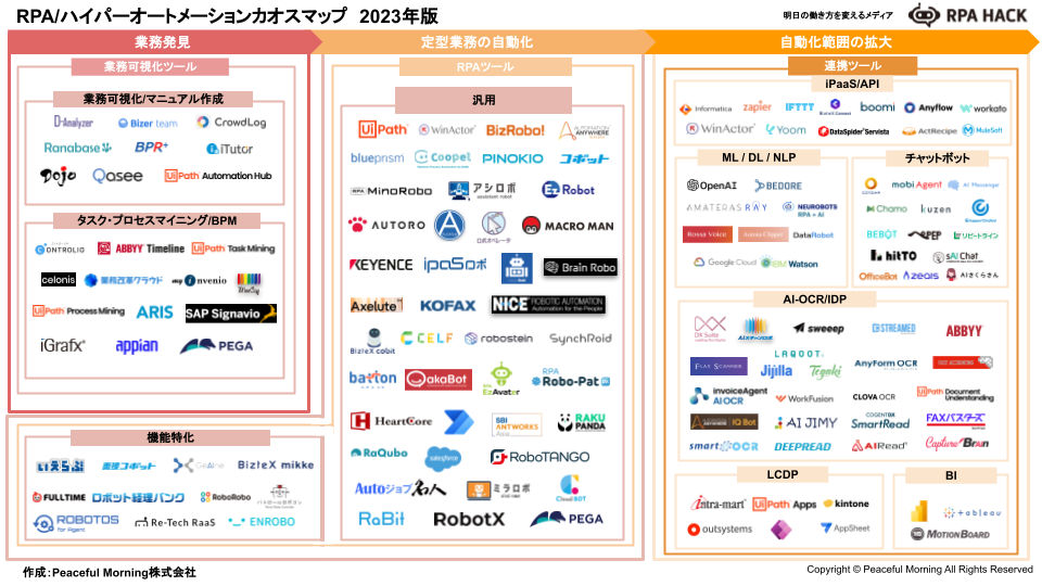そのような状況に対応するため、それらサービスを可視化した「RPAハイパーオートメーションカオスマップ2023年版」として纏めました。