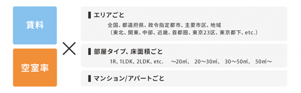 賃貸住宅の賃料および空室率に関する指標(インデックス)を「クリエイト賃貸住宅インデックス(CRIX)」として開発、国内の都道府県・主要地域・主要市区などを網羅するインデックスを、当社が保有・管理する膨大なデータ量のデータベースから算出しております。これにより、全国の各地域における、賃貸住宅の賃料、空室率の推移を時系列で把握・比較することが可能になります。