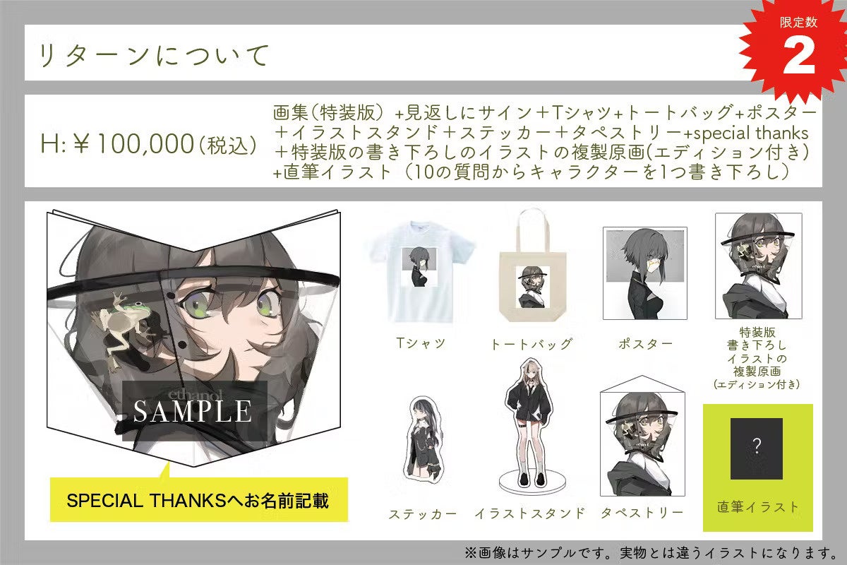 ■H.画集(特装版)+サイン+Tシャツ+トートバッグ+ポスター+イラストスタンド+ステッカー+タペストリー+SPECIAL THANKS+特装版の書き下ろしのイラストの複製原画(エディション付き)+直筆イラスト(10の質問からキャラクターを1つ書き下ろし) 100,000円