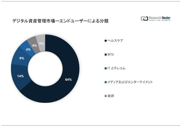 世界のデジタル資産管理市場は、BFSI、IT とテレコム、メディアとエンターテイメント、政府、およびヘルスケアへのエンド ユーザーによる需要と供給についてセグメント化および分析されています。5 種類のセグメントのうち、ヘルスケア セグメントは 2035 年に約 35% の最大の市場シェアを獲得すると推定されています。このセグメントの成長は、著しく拡大しているヘルスケア業界に多数の患者が存在することによるものです。ヘルスケア分野の病院も急速に増加しています。たとえば、2022 年までに、米国には約 6,100 の病院があることがわかりました。病院の医師と呼ばれる医師は、通常、内科、小児科、または一般診療を専門としています。