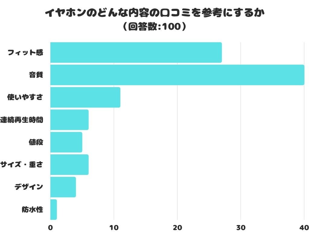 イヤホンのどんな内容の口コミを参考にするかをアンケートにて調査したところ、1位は「音質」でした。