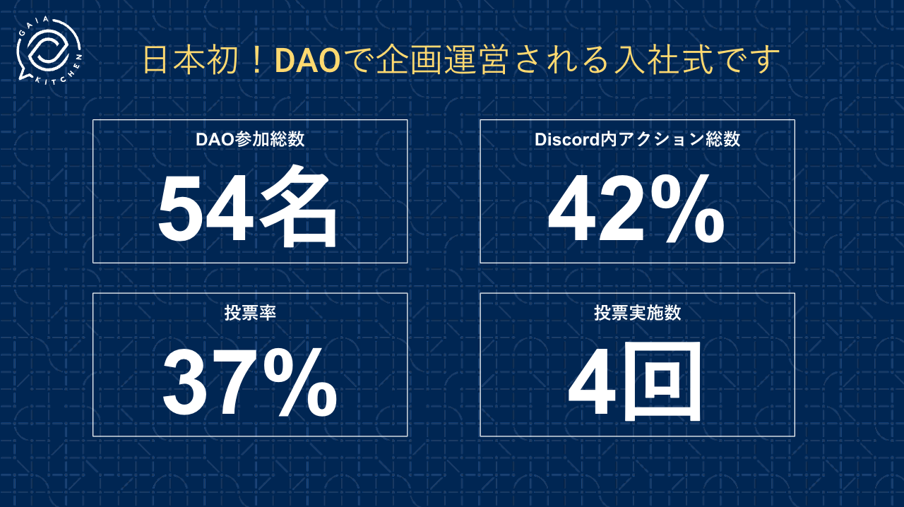 今回の入社式DAOでは、「DAOで入社式を実施する」という目標に対し、賛同するメンバーが様々な部署・地域から集まり、目標達成のために自ら手を動かし、目標達成に必要なルール設計を行い、貢献に応じてリワードが発生するという、DAOの骨格を短期間で形にすることができました。この成功を元に、入社式DAOを進化させ、社内活性のための「社内イベントDAO」としていく計画も出ています。
