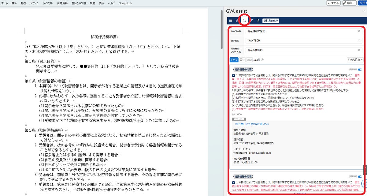 そうしたお客様からの声に対応するため、GVA assistでは「過去ナレッジ活用機能」を提供してきました。あらかじめ審査済みWordファイルをGVA assistに保存することで、キーワード単位の検索において、契約類型、取引先名や変更履歴やコメントを含んだ変更対応例といった様々な切り口で絞り込みを可能にすることで課題の解消を図ってきました。